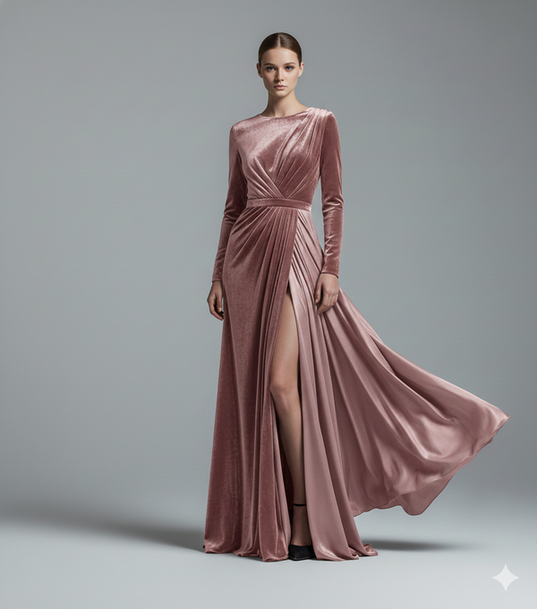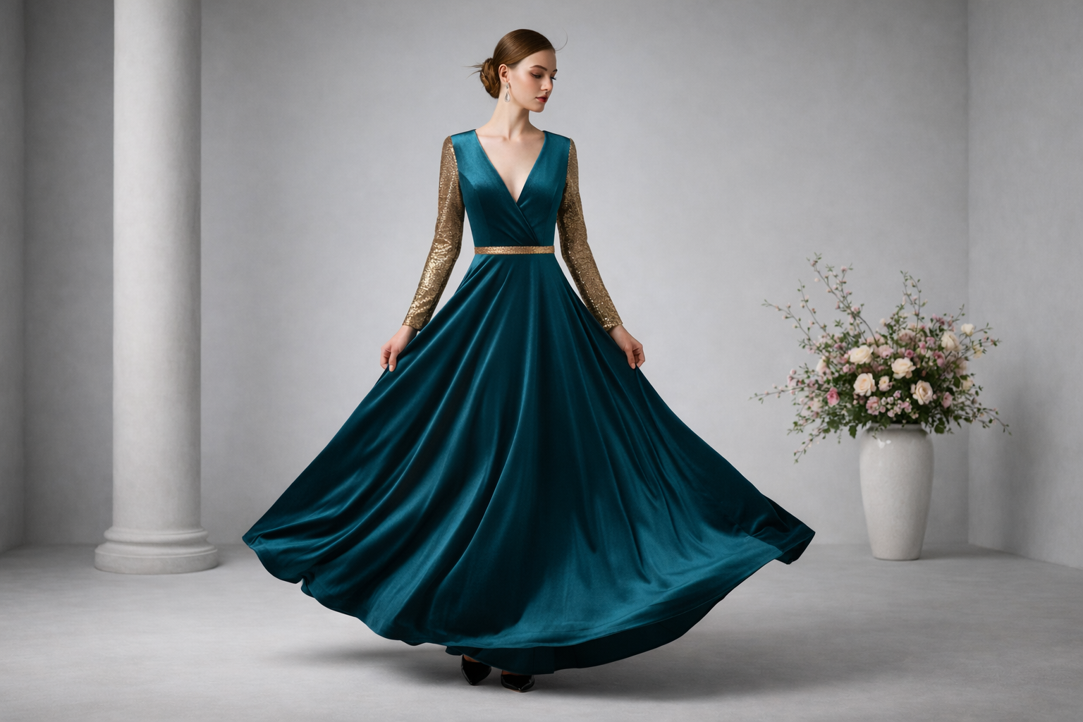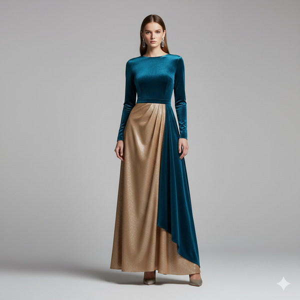 Luksusowe, stylowe i eleganckie. Aksamit i błyszczący krep nadają sukience wyrafinowaną głębię i subtelny połysk. Doskonałe na wieczorne wydarzenia i eleganckie przyjęcia.