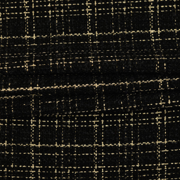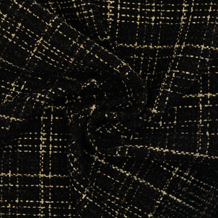 Chanelka Luzio "Złota Krata" to elegancka propozycja w klasycznej czerni ozdobionej złotą kratką, która dodaje całości luksusowego charakteru. Wyrazisty wzór w połączeniu z mięsistą strukturą materiału sprawia, że tkanina doskonale podkreśla szyk i prestiż każdej stylizacji.