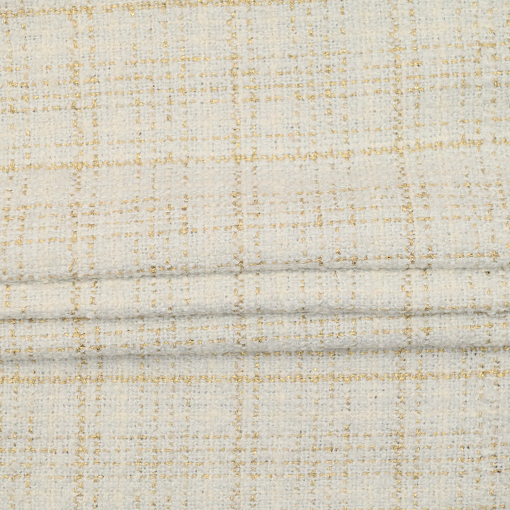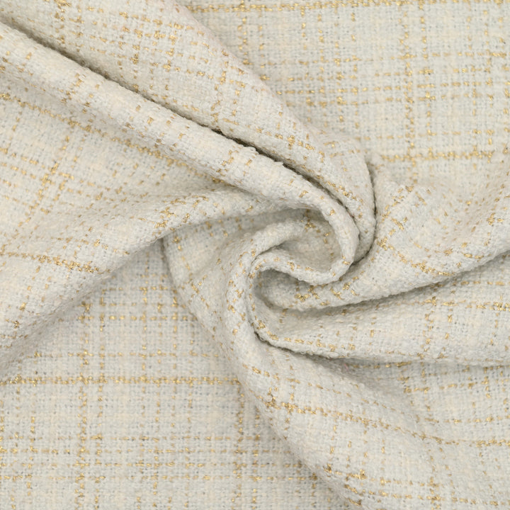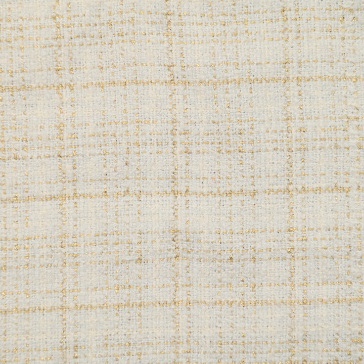 Chanelka Luzio "Złoty Blask" to luksusowa tkanina o jasnym, kremowym tle z delikatnym połyskiem złotych nici tworzących klasyczny wzór kraty. Jej subtelna elegancja i wyrafinowany styl sprawiają, że idealnie sprawdza się w projektach dla kobiet ceniących klasę, szyk i nowoczesne podejście do klasyki.