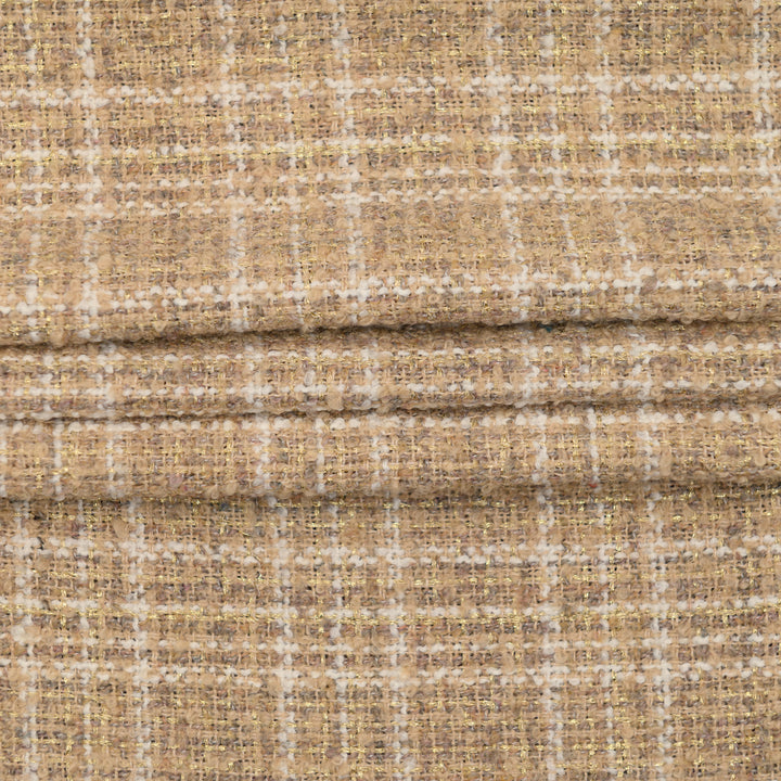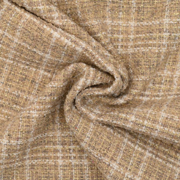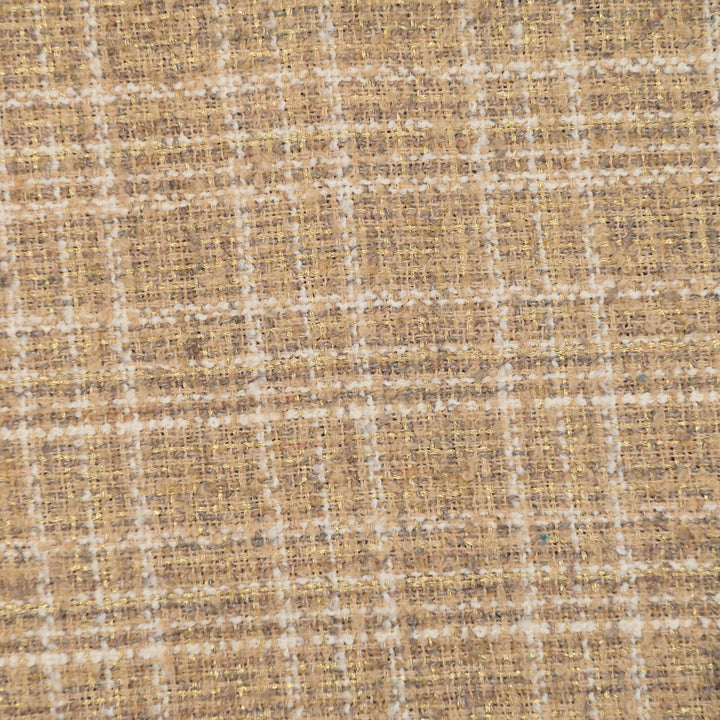 Chanelka Luzio "Karmelowa Krata" to ciepła, elegancka tkanina o charakterystycznym splocie w odcieniach karmelu, beżu i złota. Klasyczny wzór kraty podkreślony metaliczną nitką nadaje jej wyjątkowego blasku i szlachetnego wyglądu. To materiał stworzony z myślą o modzie premium – łączy w sobie ponadczasowość z nowoczesnym szykiem.